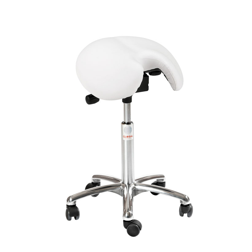 Disponible con telas en muchos colores, como la imitación de cuero blanco. El ajuste de altura infinito del asiento está disponible a través de una perilla debajo del sillín o de un anillo operado con el pie en la base.