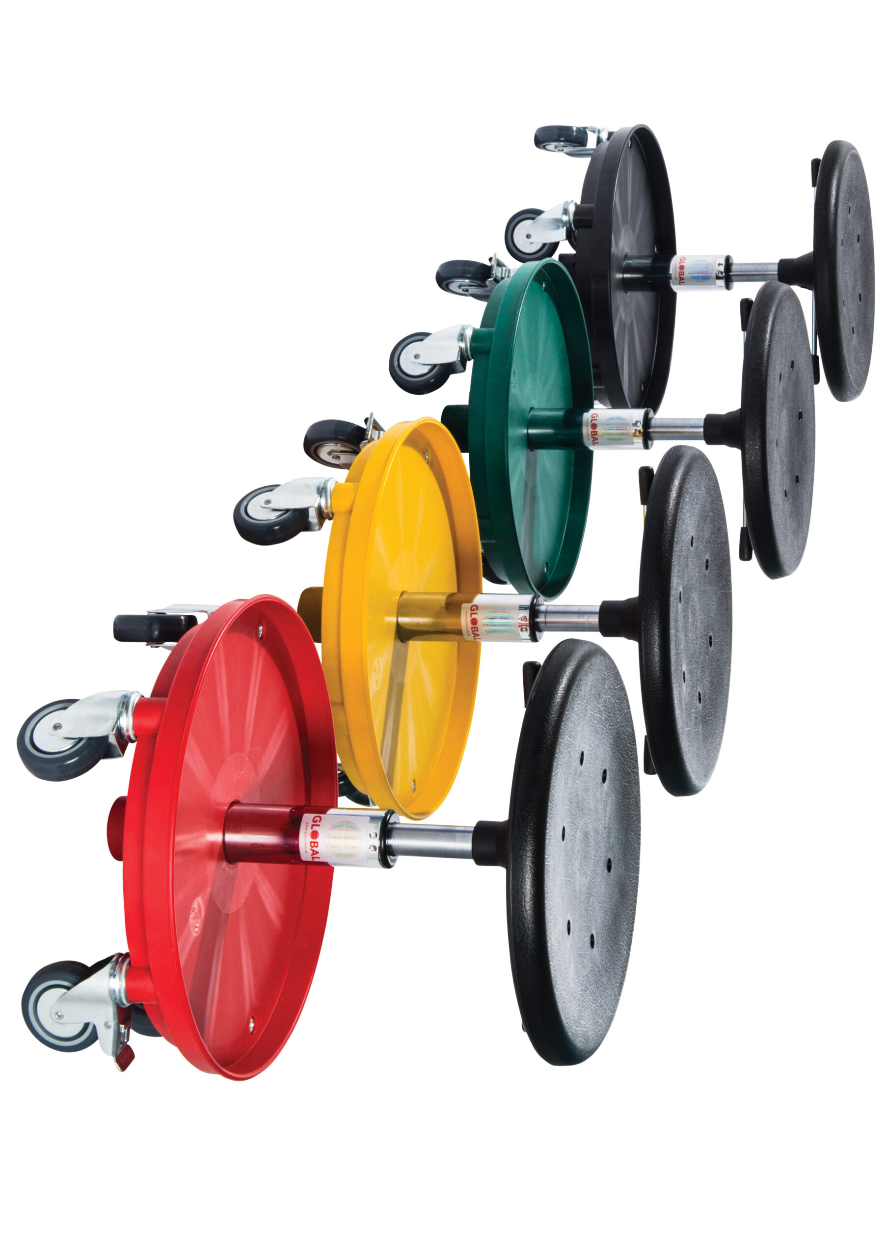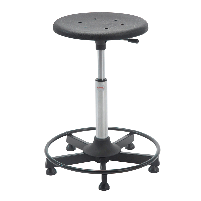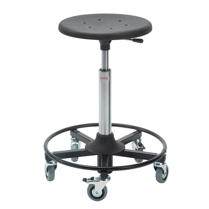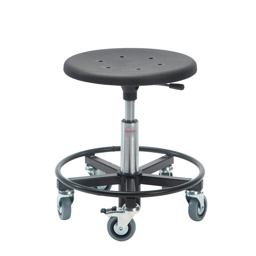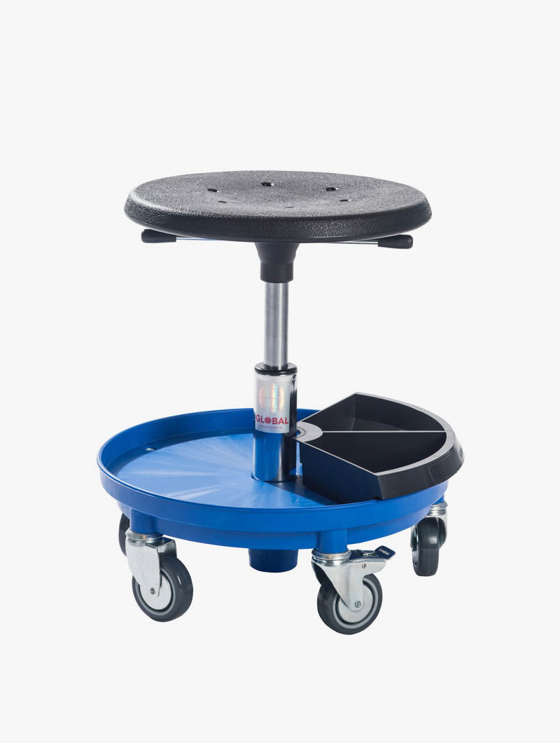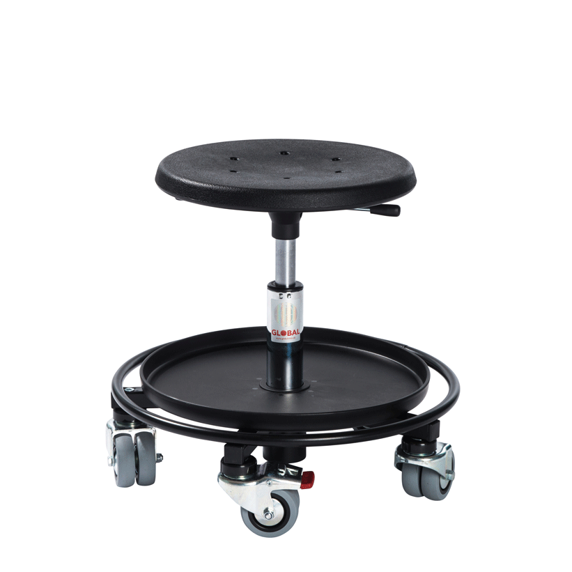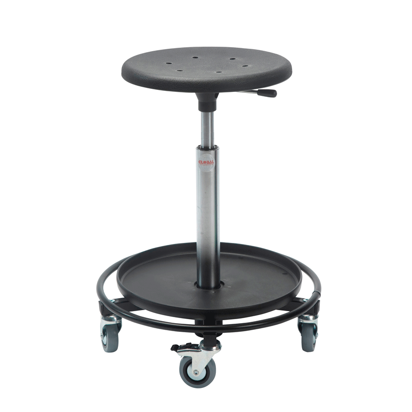 Los taburetes con ruedas se pueden ajustar en altura, y tienen ruedas muy resistentes donde dos de ellas disponen de freno para una mayor estabilidad. Pueden ser equipados con bandejas, cajas de herramientas y diferentes tipos de asientos. Los asientos de poliuretano son resistentes a un número de productos químicos y, al mismo tiempo, son fáciles de limpiar.