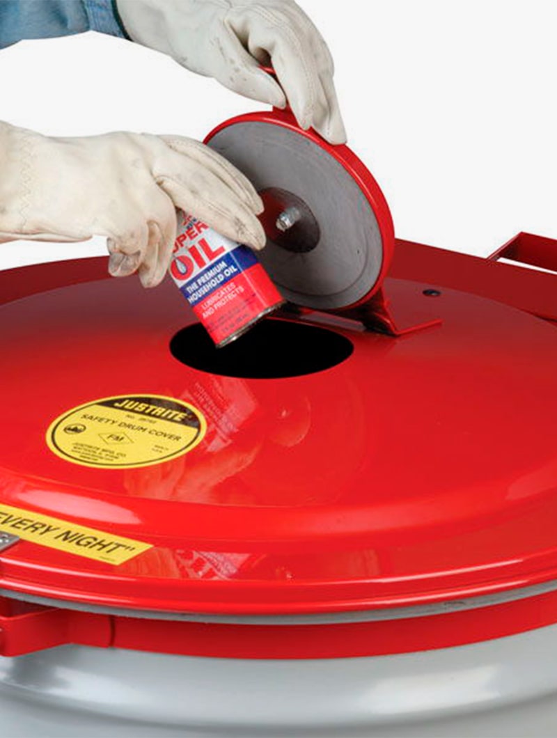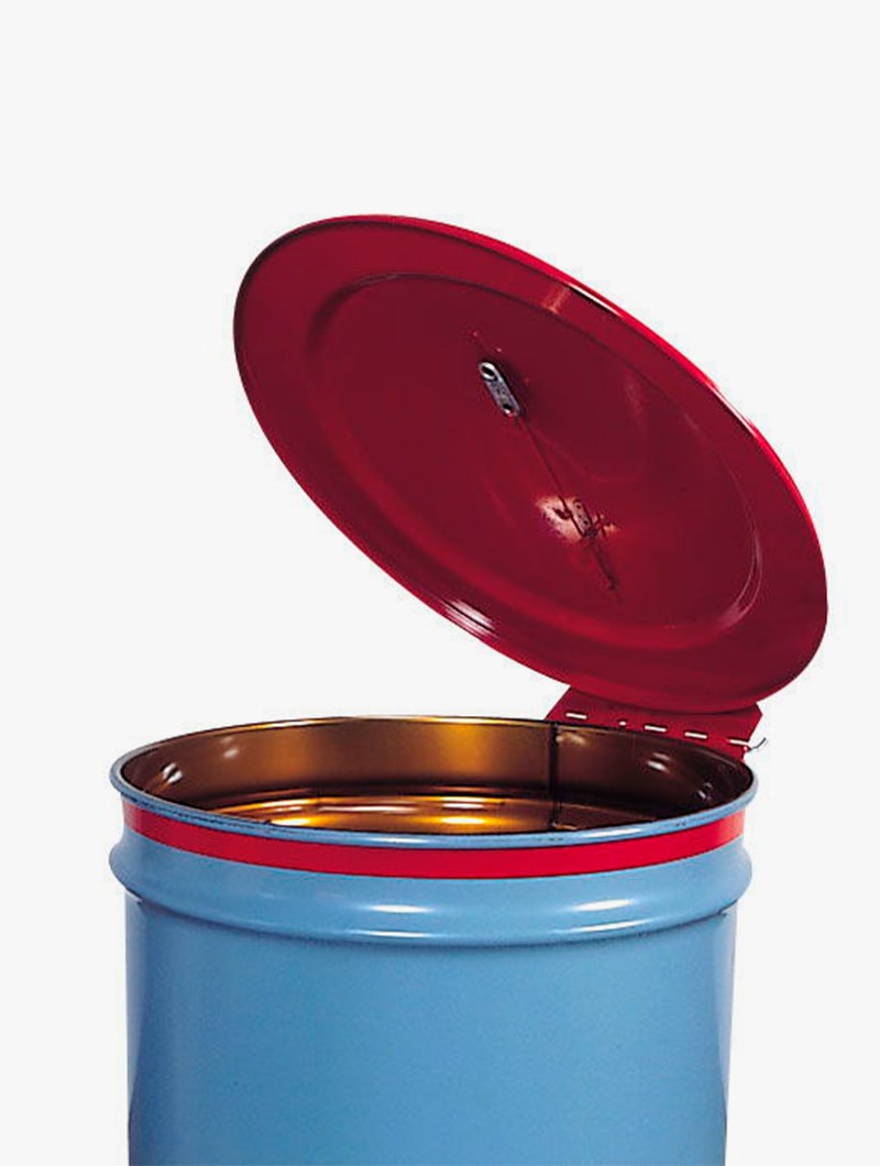 Tapa metálica con cierre automático que convierte un bidón en un pequeño depósito para desechos inflamables.
