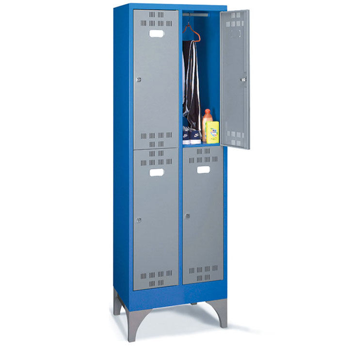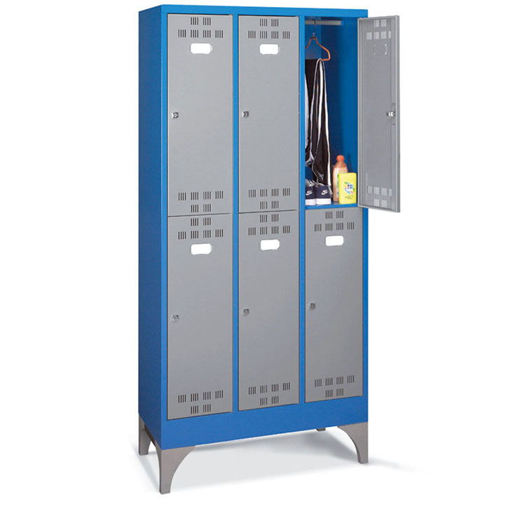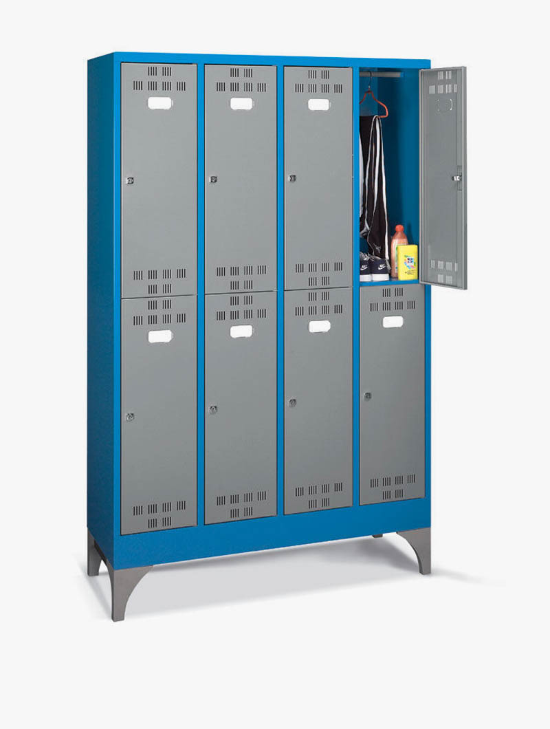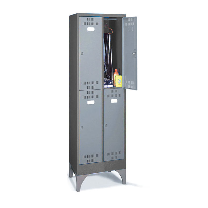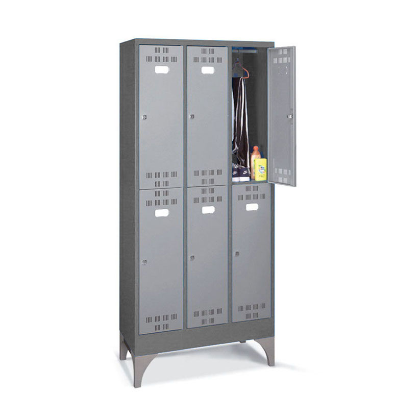 Las taquillas metálicas PERFOM GS190 pueden llevar compartimentos verticales o casilleros para guardar objetos y efectos personales de tamaño mediano y pequeño. Los anchos de puerta pueden ser de 300mm o 400mm. Según las diferentes necesidades, el techo puede ser horizontal o inclinado; este último, gracias a su inclinación, es más fácil de limpiar y junto con el divisorio limpio/sucio, representa la solucción adecuada para todos los entornos que necesiten estándares de higiene muy precisos. El compartimento interno de las taquillas metálicas para vestuarios puede dividirse por medio de una balda galvanizada, que, en algunos modelos, se puede regular en altura.