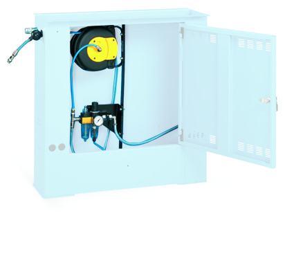 Compuesta por: Un entrada fija posterior con tubo Ø10mm. y final (de1/4”)_(Ø9-12mm.) para conectar con alargador (no incluido). Un enrollador de 4 metros de tubo de diámetro interno de 5,5mm. con una conexión a rosca de 1/4” para fijación del utensilio, capacidad de 9 litros por segundo*. Una salida fija anterior con tubo de Ø10mm. y final con rosca de1/4” con tapón, capacidad de 11 litros por segundo*. Un filtro reductor con manómetro el cual puede ser utilizado con una presión máxima de 10 bar, su capacidad es de 11 litros por segundo con una presión de uso igual a 6,3 bar.