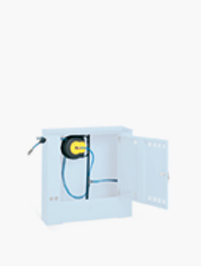 Compuesta por: Una entrada fija posterior con tubo Ø10mm. y final (de3/8”)_(Ø9-12mm.) para conectar con alargador (no incluido). Un enrollador de 4 metros de tubo de diámetro interno de 5,5 mm. con una conexión a rosca de 1/4” para fijación del utensilio, capacidad de 9 litros por segundo*. Una salida fija anterior con tubo de Ø 10 mm. y final con rosca de 3/8” con tapón, capacidad de 11 litros por segundo*. N.B. Todas las conexiones (excepto el enrollador) son de 3/8”.