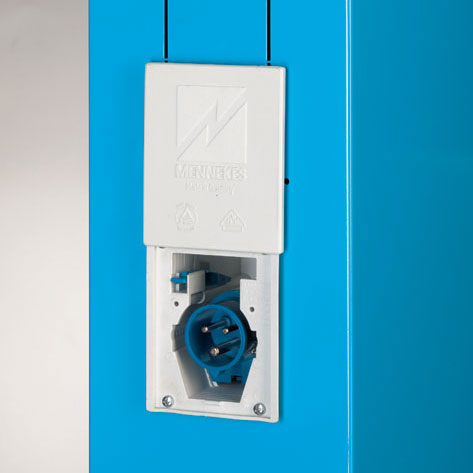 Los armarios con placa de conexión vienen de serie con una puerta lateral completa de cerradura de cilindro y dos llaves. Este armario se puede montar con toma de conexiones eléctrica y/neumática. El armario con toma de conexiones viene además de serie con magnetotérmico 2 P 230 V y conectada (a través de una canaleta) a un toma industrial en la parte posterior con tapa de cierre. Grado de protección.