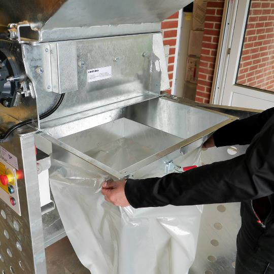 Gracias a una reducción de volumen de hasta un tercio, esta trituradora ayuda a optimizar el espacio de almacenamiento, reducir la manipulación manual y minimizar los costes en servicios de recogida o tasas de vertedero. Las bolsas se adaptan fácilmente al cono para una recogida higiénica y segura.