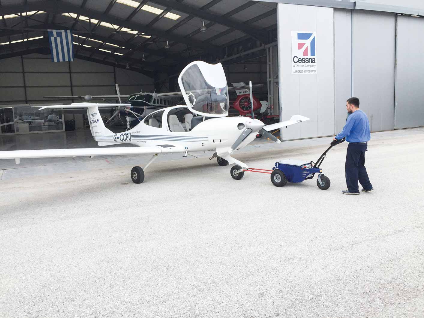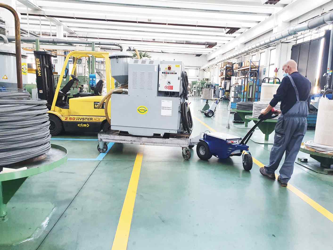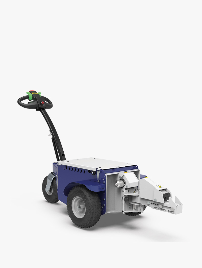 El control remoto opcional es óptimo para mover líneas de trolleys: el operador puede controlar la dirección de los trolleys mientras conduce la máquina desde la distancia.