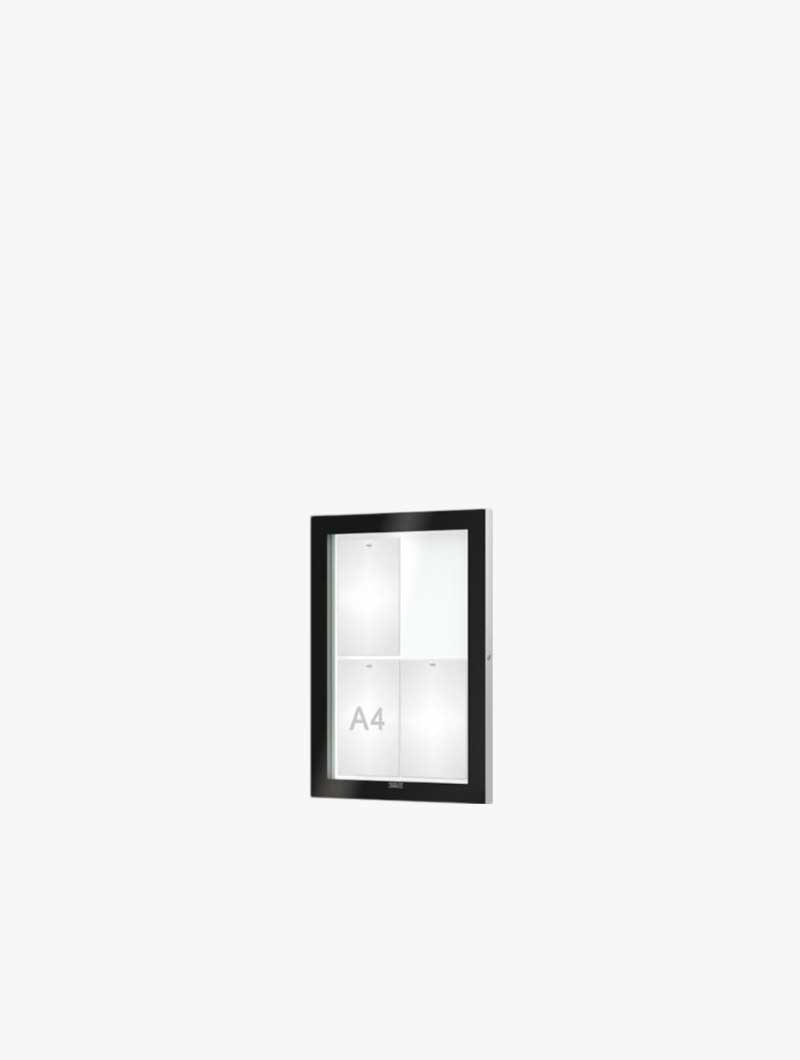 Acristalamiento de vidrio de seguridad de 4 mm de espesor. Cierre con cerradura de seguridad con 2 llaves. Bisagras invisibles, resistentes y estables. Acabado interior con el fondo en chapa galvanizada lacada. Dorso blanco, gris claro. Acabado del marco en aluminio anodizado plateado.