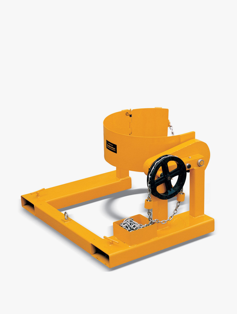 Este dispositivo simple y altamente efectivo es capaz de voltear completamente (360º) un bidón de 200 litros, lo que es esencial para procesos de vaciado total, dosificación o mezcla.