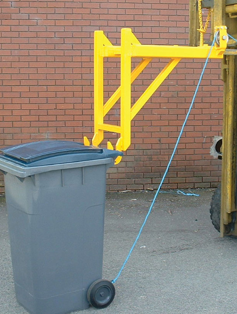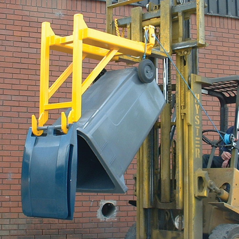 Se trata de una solución práctica y eficaz que se adapta a las horquillas de la carretilla elevadora, permitiendo recoger y vaciar contenedores con ruedas (desde 80 litros hasta 360 litros) de manera completamente segura.